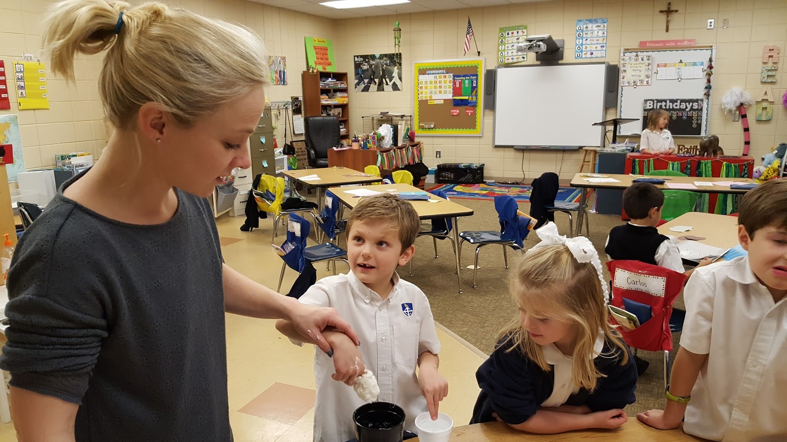 The students at our Holy Spirit campus recently studied Arctic animals and the blubber that helps keep the animals warm. Mrs. Emily Cutts created "blubber" for each of her first grade students. The students were able to test the blubber out when Mrs. Cutts had them hold their "blubbered" finger in a cup of water with ice. None of the students were able to feel the cold water because their "blubber" kept them warm!